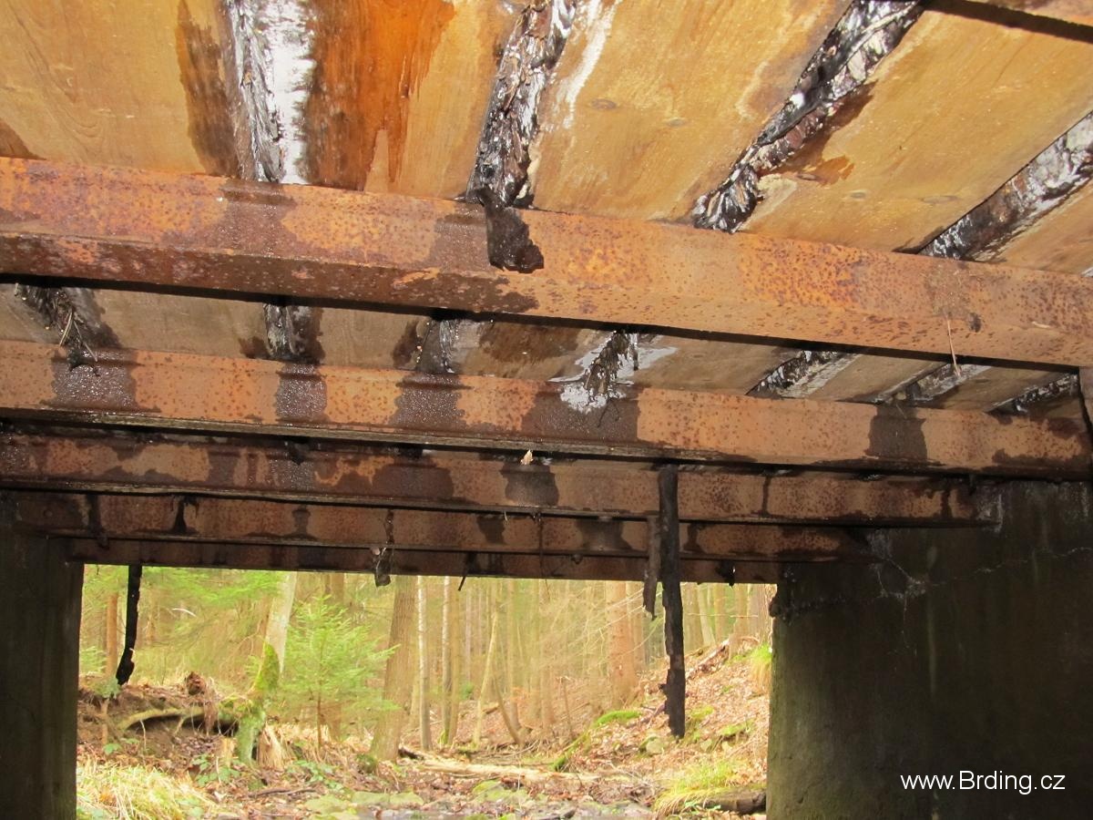 Pak sebemenší stopu na dlouho ztrácíme, ale zhruba po 3 km se na nás opět usměje štěstí. V hůře přístupném údolí Padrťského potoka nacházíme velmi zřetelný násep a to v polovině větve S-6 (viz.6 foto). Místo by mělo přibližně souhlasit i s dobovou fotografií. Jediné co jsme tedy prozatím našli jsou stopy v terénu, nic konkrétního ale v ruce nemáme. Pomalu se začínáme vracet, křižujeme větev S-4 a přes Palcíř a Skořice míříme zpět do lesa JV od kóty Záborčí. Tady konečně nácházíme konkrétnější stopy po Kolvínce. Na malém můstku přes potok zrekonstruovaném v roce 1949 jsou použity kolejničky z úzkokolejky a o pár metrů dál v lese nalézáme ze země vyčnívající kus kolejnice (viz.4 a 5 foto).