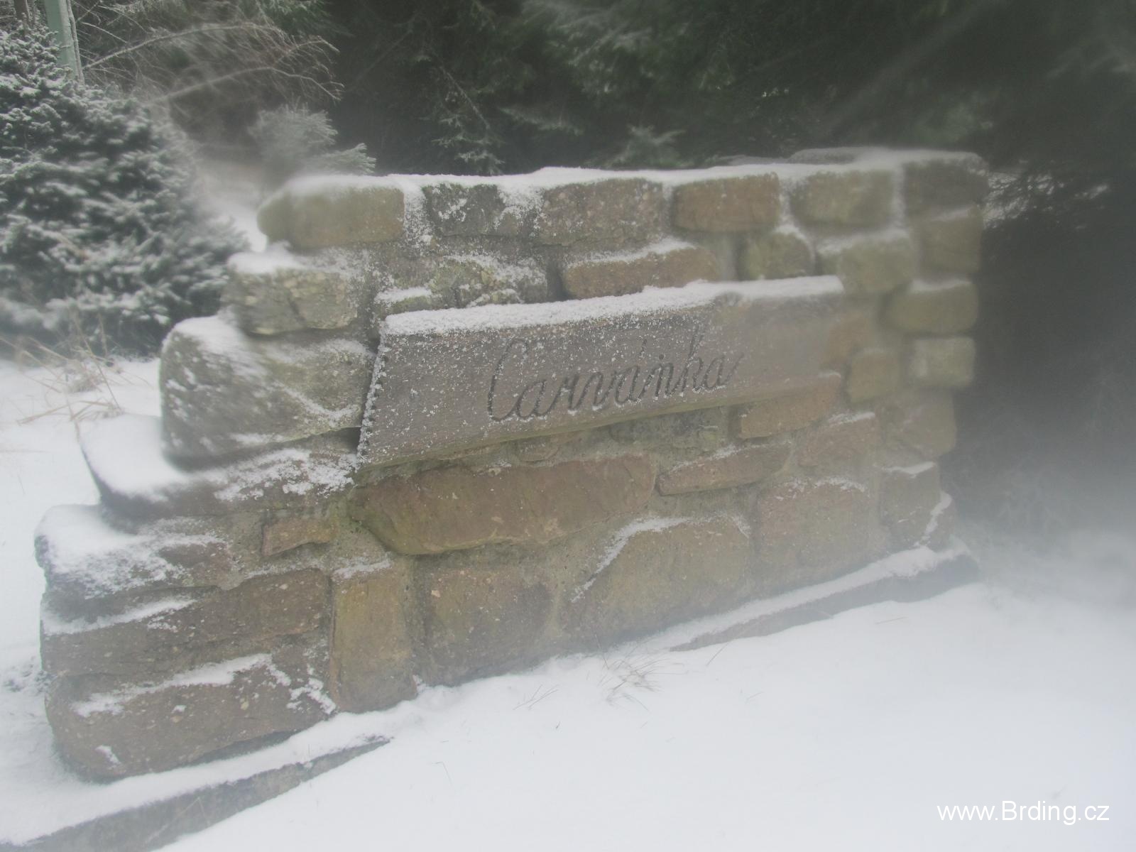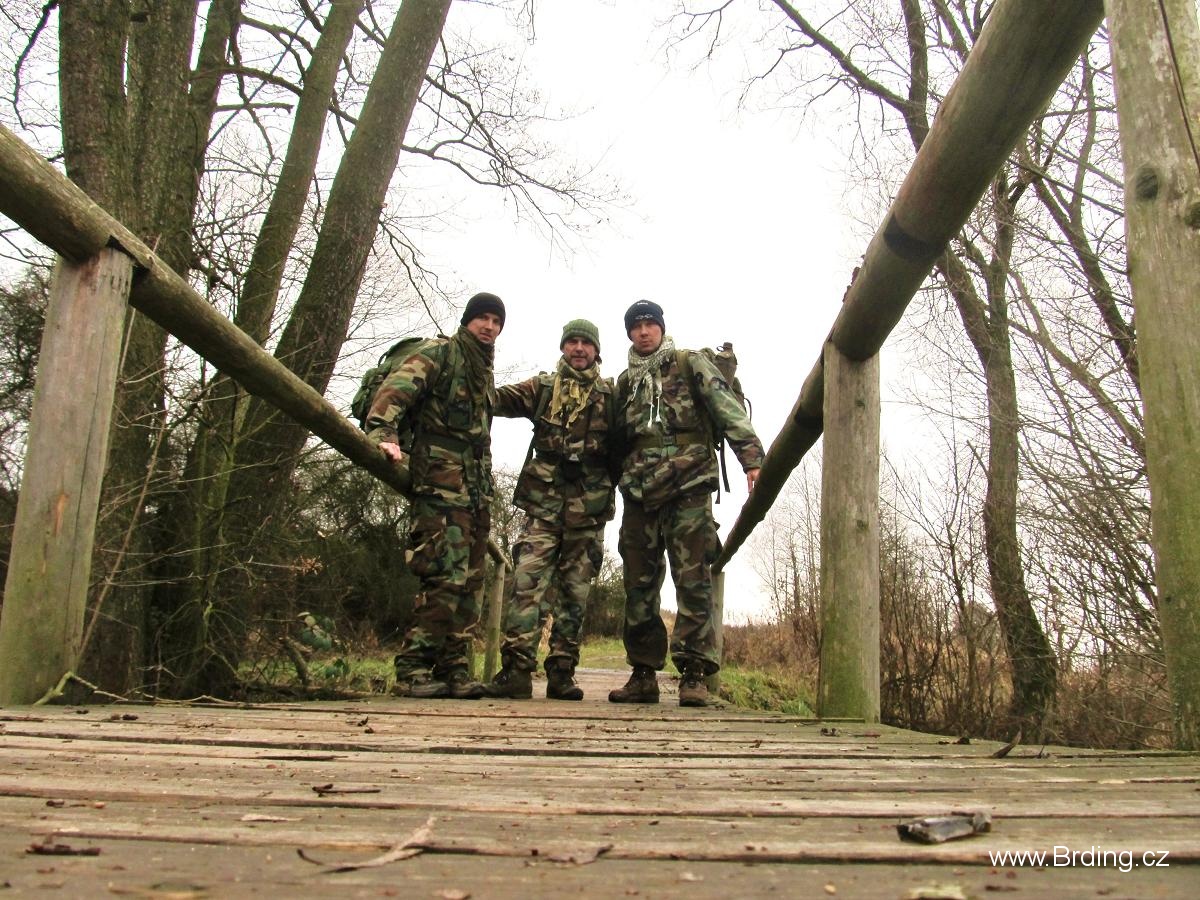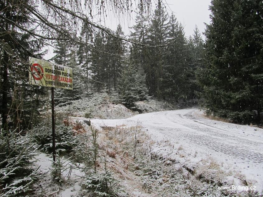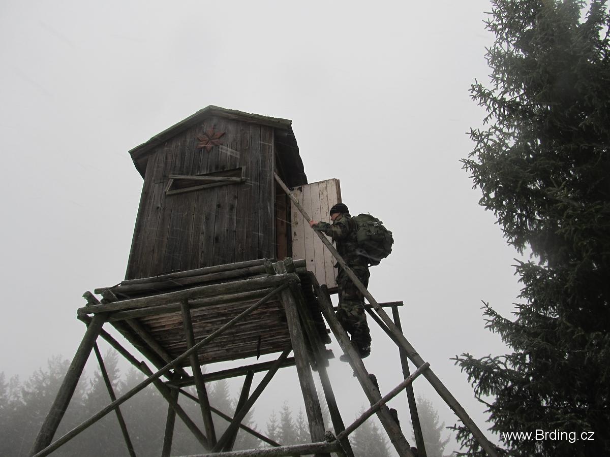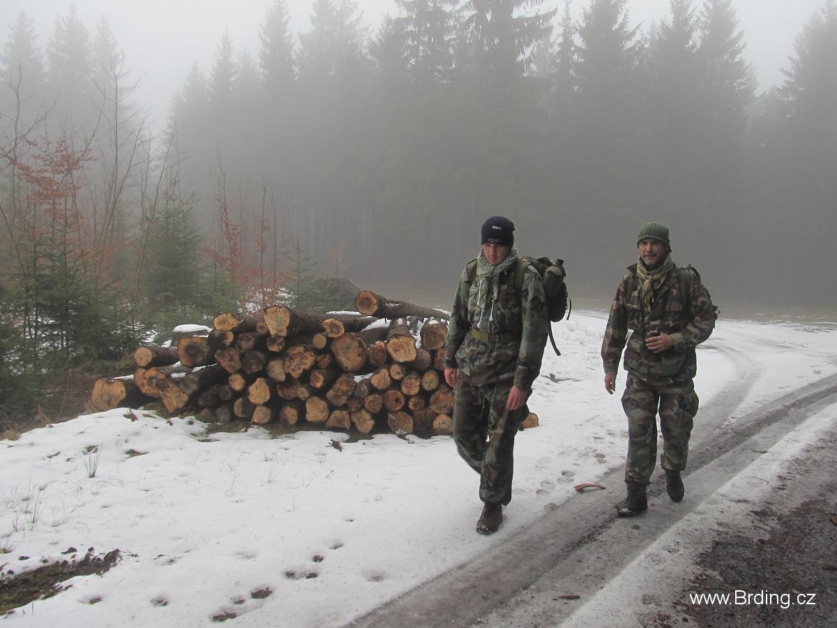 Počasí připomíná spíš brzké jaro nebo pozdní podzim, je mlhavo, 5° nad nulou a docela to fouká, po sněhu ani památky. Jsme tím nezimním počasím trošku zklamaní, protože loni jsme zažili opravdovou brdskou zimu, ale co, hlavně že jsme v lese. Po asfaltce tedy stoupáme přes poloopuštěnou ves Velcí a kolem docela zajímavě řešené nádrže na Pstruhovém potoce se dostáváme na dopadovku Brda.