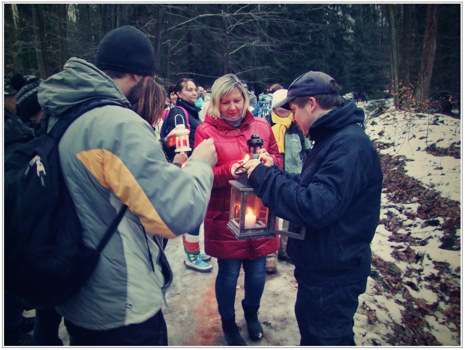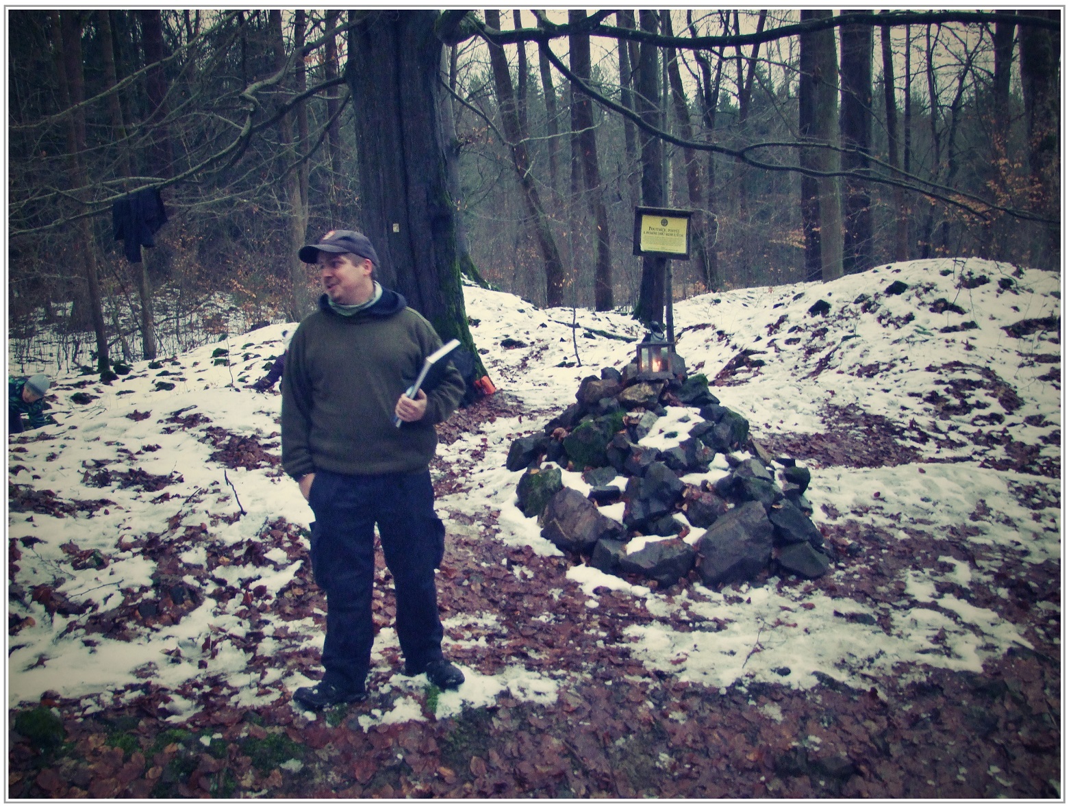 . Čekání na samotnou akci nám trochu zkrátila dopolední procházka údolím Bradavy a krátké posezení na míšovském grillu. Okolo půl druhé se vydáváme společně s prvními účastníky do brdských lesů na pouť k ruinám bývalého teslínského kláštera. Zledovatělá cesta a zbytky sněhu nám všem sice chůzi trochu komplikují, přesto za necelou hodinku stojíme šťastně na místě před mohylou s křížem.
