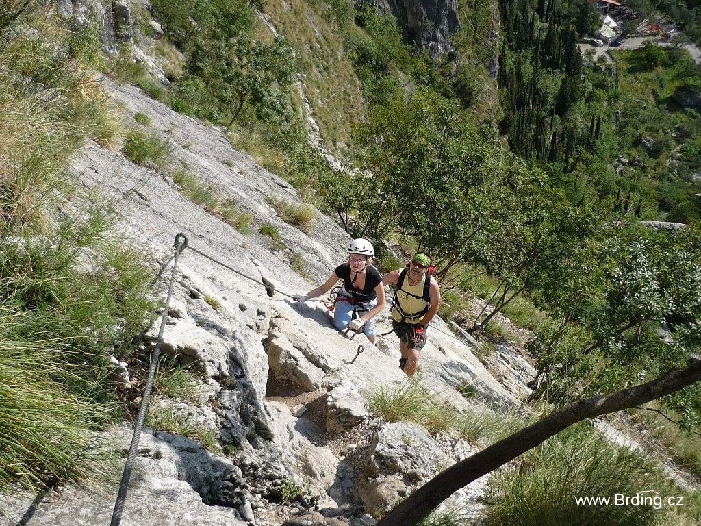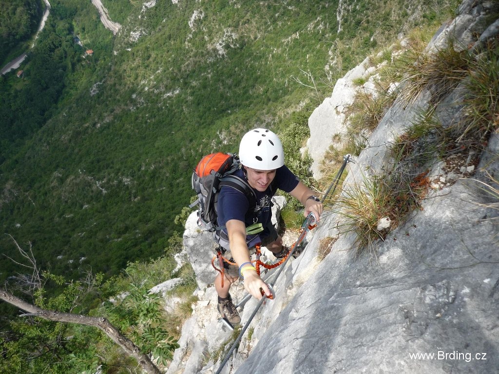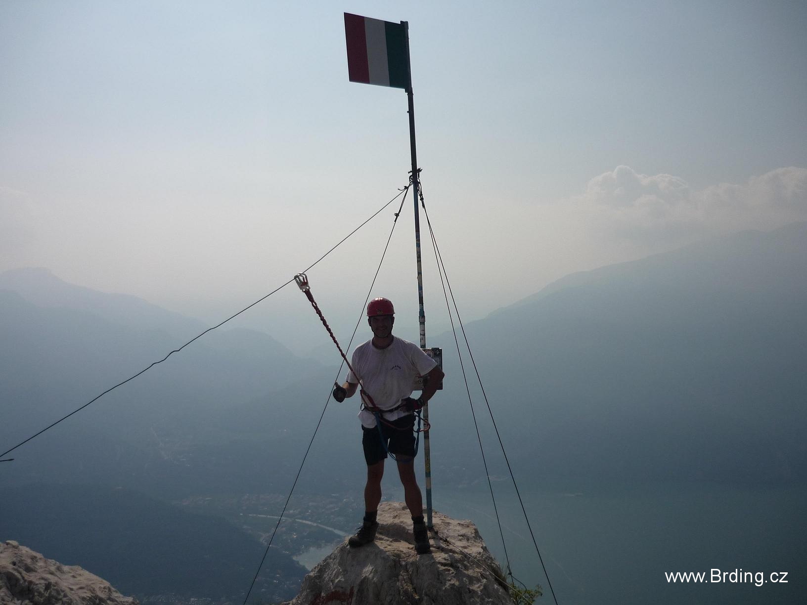 Stoupáme výš a výš, pod náma se objevuje jezero i se stovkami lodiček na jeho hladině a my si užíváme nádherných výhledů. Už jsme zhruba ve výšce 800 m a na vrchol je to jen kousek. Končí zde ocelové jištění a zbytek pokračuje jen chodeckým terénem. Všude okolo jsou dobře patrné pozůstatky z I.světové války, okopy, jeskyně, střílny. Dostat sem veškerý ten materiál musela být šílená dřina!!