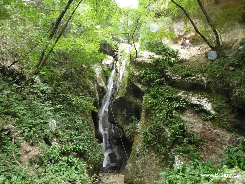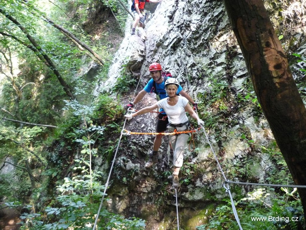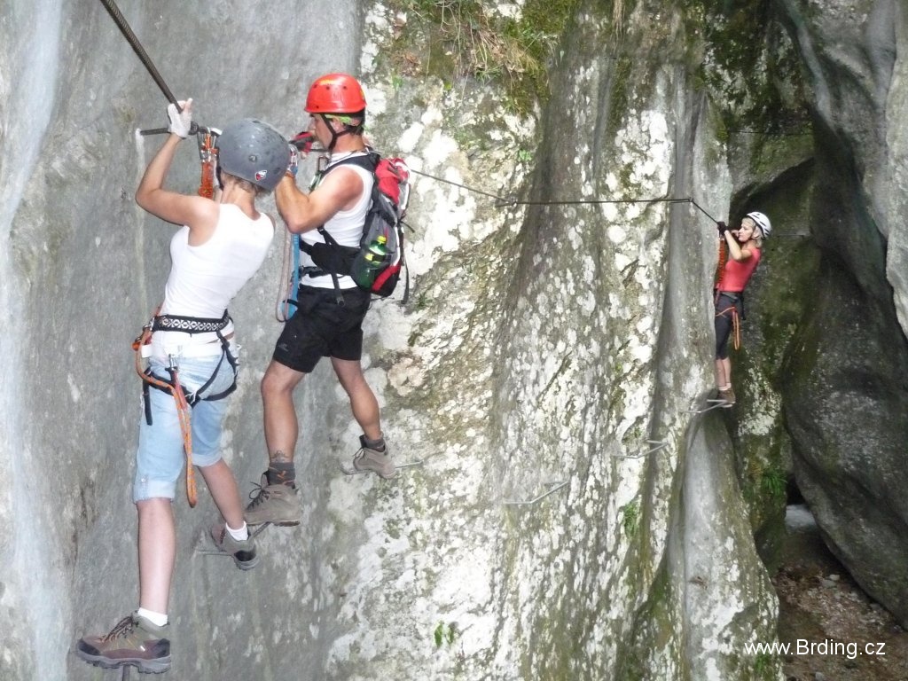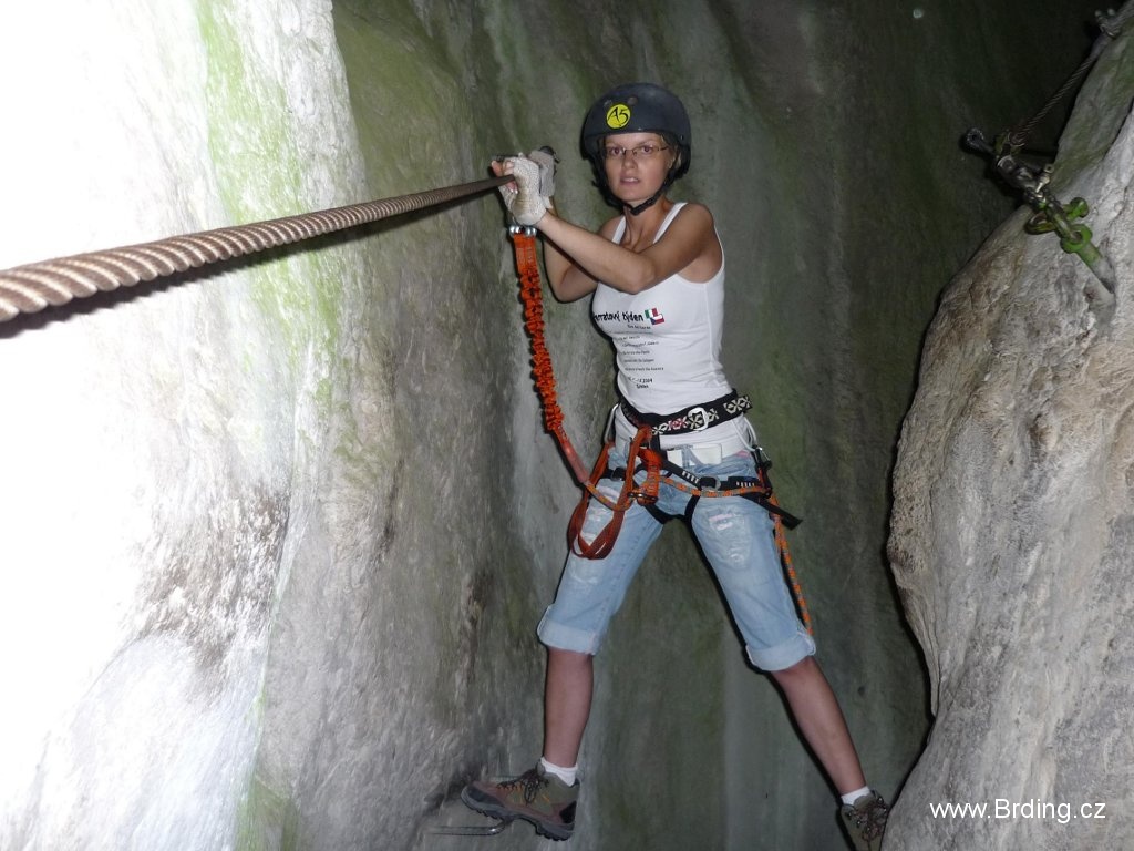 Tohle je trochu jiný způsob lezení. Nešplháme do závratných výšek, ale pohybujem se v hlubokém úzkém kaňonu, maximálně 10 15 metrů nad vodou. O to víc jde ale o techniku, časté převisy nejsou vyjímkou, skála je od vody vlhká a lezení spestřujou lanové mosty.