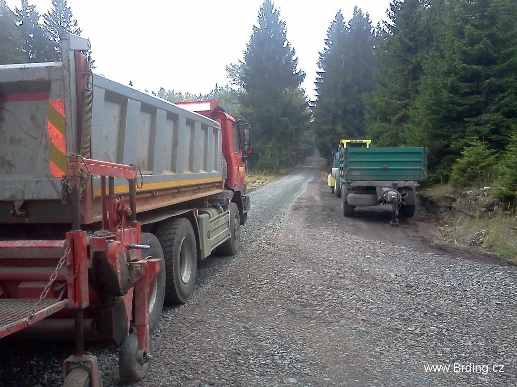 Při odbočce na Prahu s překvapením potkáváme 4 auta silničářů, kteří právě asfaltujou silnici směrem nahoru k věži. Při tom pohledu se skoro nahlas musím zasmát :-). Není to tak dlouho co jsem tady psal - článek z 16.7.2011- že při sjezdu z vrcholu Prahy vždycky nadávám, protože tenhle úsek je snad nejhorší v Brdech a že se asi nikdy nedočkám toho, že by to někdy silničáři opravili. A hle, uběhly 3 měsíce a stal se malý zázrak - na silnici se pokládá nový asfalt!!