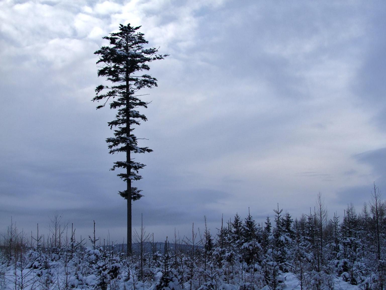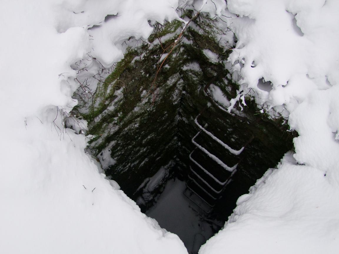 Nízká oblačnost s těžkými sněhovými mraky nepřeje ani výhledům, ani focení a tak se začínám pomalu chystat na cestu zpět. Nechci se vracet po silnici, protože po ní chodím vždycky a proto jdu jen tak, kudy mi napadne a jak mi terén a sníh dovolí. A rozhodnutí to nebylo rozhodně špatné! Po pár stech metrech se přede mnou najednou na zasněžené zemi objevuje záhadný čtvercový otvor, který vede někam dolů a který je osazen i ocelovými stupy.