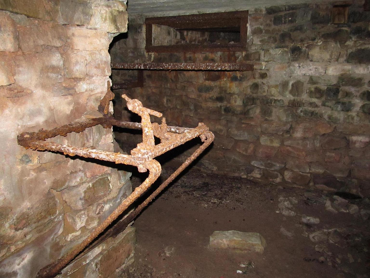 Jsem mile překvapen, že by po tolika letech nový objev na Jordánu?! Ani chvilku neváhám, sundavám bágl, nasazuju čelovku a opatrně a s očekáváním slézám na dno. Tady jsou hned na začátku pootevřené železné dveře, za nimi malá místnost plná odpadků (což svědčí o tom, že nejsem zdaleka první, kdo tento objekt objevil) a druhé železné dveře, vedoucí do dalších prostor. Za nimi už se nachází větší místost přibližně ve tvaru T. Ve zdech je několik různě tvarovaných otvorů a na stěnách zbytky nějakých konstrukcí.