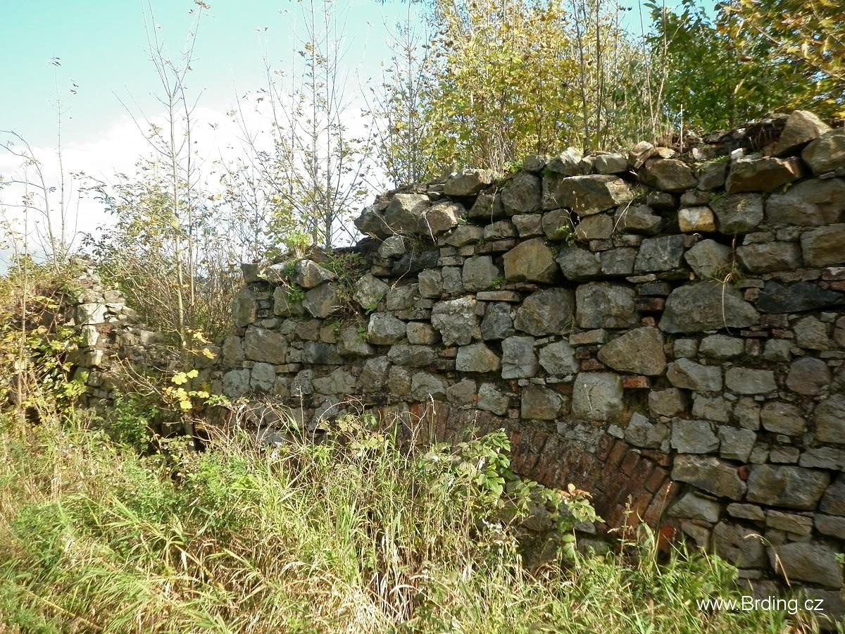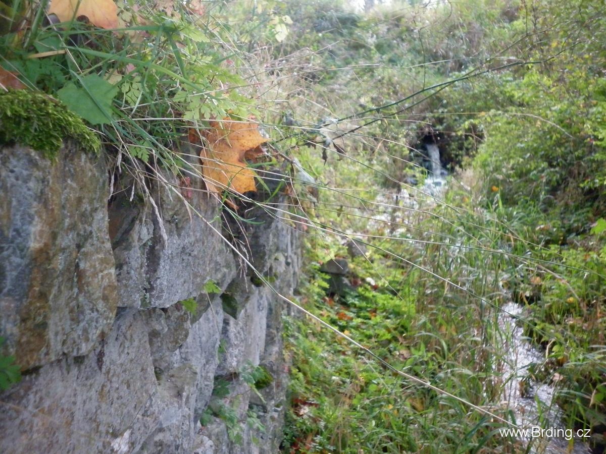 Přímo pod hrází první nádržky je asi největší dochovaná část zdi kterou můžeme v okolí nalézt. Jedná se o torzo Vintiškova mlýna. Pod hrází druhé nádržky, v místech původní Śindelky, je vidět zeď ve výpusti a tady se mi také podařilo najít docela unikát.
