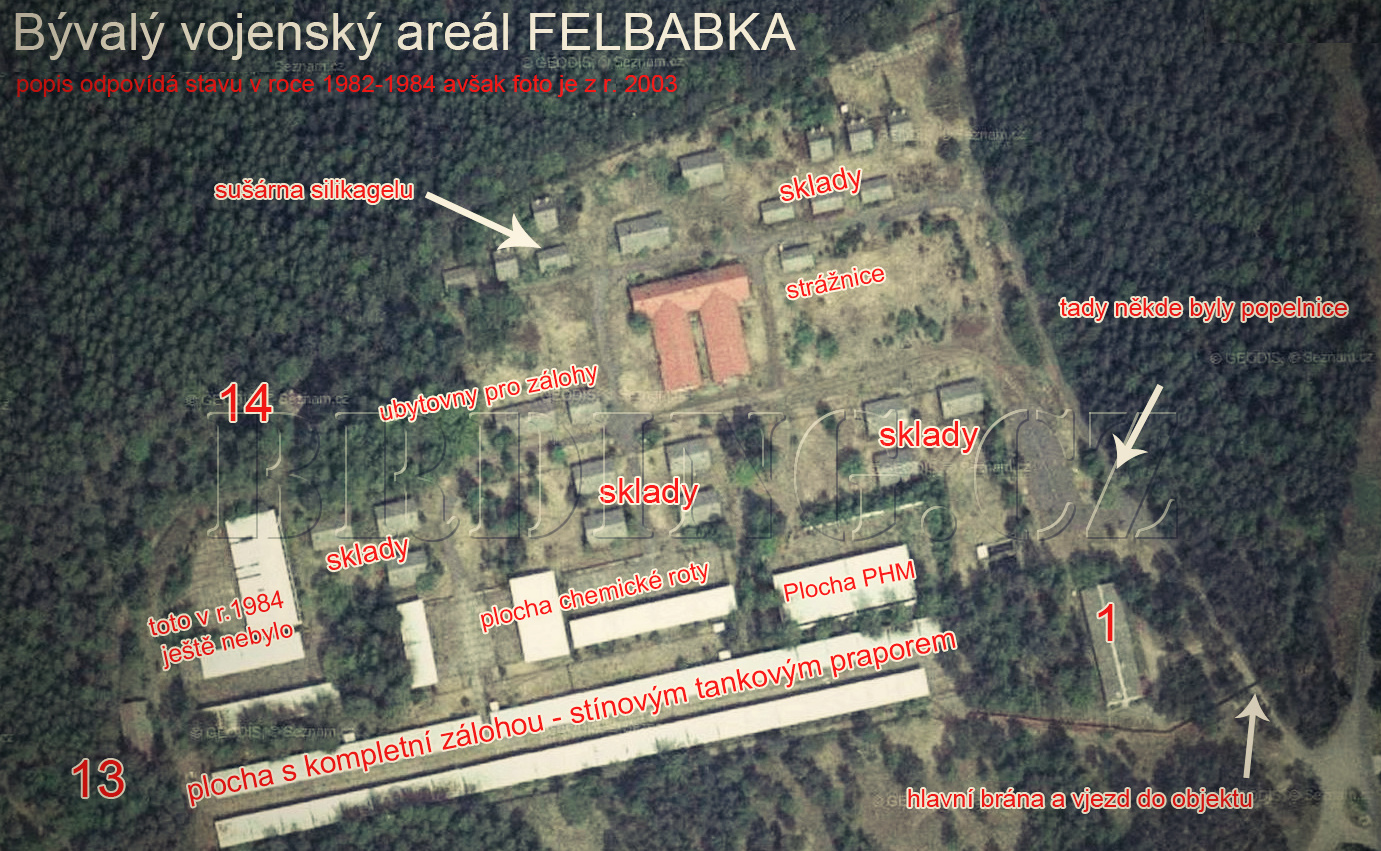 Na Felbabce sídlil VÚ 5729/R - ROUT - rota oprav uložené techniky, která patřila pod VÚ 5729 Strašice. Na Felbabce byla umístěná technika přesně v síle a složení tankového pluku (byl to takový stínový dvojník Strašic). To obnášelo kompletní techniku pro 3 tankové prapory, což je 3 x 31 tanků (v té době ještě T-55, Strašice již od 1981 ale postupně přezbrojovaly na T-72), motostřeleckou rotu - BVP 1, spojovací rotu, ROT (rotu oprav techniky), ženijní rotu (mj. pásové OT-62), chemickou, zdravotní, průzkumnou a další, které v té době byly ve struktuře tankového pluku. V případě mobilizace měly narukovat zálohy, z části z okolí Hořovic, většina pak pravděpodobně z Prahy a okolí. Z tehdejšího hořovického ČSAD se měly také zrekvírovat nákladní automobily, které by byly při mobilizaci použity. Tento pluk by po mobilizaci tvořili z naprosté většiny záložáci, zde sloužící lampasáci by zastávali funkce od velitelů praporů výš. Tanky T-55 a BVP 1 byly umístěny na tzv. velké ploše, což je ten dlouhý pruh na mapě. Každý rok se dělala tzv. překonzervace - každoročně v létě 1 tankový prapor. To obnášelo vyříznutí tanku z konzervačního obalu - ten tvořilo plátno zalité silnou vrstvou hnědého vosku, tento obal zakrýval kompletně celou věž, řidičský příklop a motorový prostor. V rámci této překonzervace se také vyndávala tzv. "kila" - náboje ráže 100 mm do tankového kanonu. V každém tanku jich bylo kolem 40, takže na celém praporu jsme si pořádně mákli, jedno "kilo" vážilo kolem 35 kg podle druhu - tříštivý, průpalný, protipanceřový (ty byly nejtěžší :( ). Tank se vyčistil, nastříkal novým nátěrem a znovu zakonzervoval. V roce 1982 se navíc začalo z modernizací tanků prvního praporu. Měnily se pásy za tzv. "keramičáky" - stejné jako mají T - 72 a navařovaly se PL věžičky pro protiletadlový kulomet ráže 12,7 mm (místo původně rozměrného poklopu nabíječe). Tak předpokládám, že další dva roky - 83, 84 v létě se pokračovalo na dalších dvou praporech. Co vím od souseda, který náhodou na Felbabce sloužil v letech 75-76, tak to zde fungovalo v té době stejně . Za jeho služby se prý montovali ty přístřešky z hliníkových prvků, které veškerou techniku na plochách zakrývala. Mám dojem, že to tak fungovalo do roku 1989, takže si myslím, že zhruba 20 let (70. a 80. léta) tu byl onen záložní strašický tankový pluk. Palpost patřil pod dělostřelce z Jinců, my tankisté jsme s ním neměli nic společného (mimoto, že jsme tam občas projeli pásovou techniku). Na rotě v letech 1981-83 sloužilo kolem 40 záklaďáků a tak do 10 lampasáků (těch byla většina rotě nadřízených - velitel záložního pluku, technik pluku a velitelé praporů + nějací stříbrní "pošťáci". V zimě jsme jako záklaďáci chodili do stáže - 2 stanoviště - ve dne strážní věž, v noci pochůzka ve dvojitém oplocení, psi nebyli. Když koukám na plánek, tak za nás na místě psinců bylo hřiště na nohejbal. V létě se makalo na technice a do stráže chodili z praporů ze Strašic. Velitelem roty v letech 81-83 byl praporčík (nebo nadpraporčík) Samitán (strašná svině) a technikem roty "Jožin" Paštéka - prý tam byli už v 1975. Když jsme šli na jaře 83 do civilu, tak jako nový velitel tohoto záložního pluku (podléhal veliteli pluku ve Strašicích) přišel major Maťúš, matně se pamatuji na jednotlivé velitele praporů - kpt. "Bimbo" Nápravník, mjr. Hron "Jéňa Brouček" - přišel mi tam v té době jediný normální, kpt. Dostál. Technikem pluku byl mjr. Houška. Abych nezapomněl, hotovostní Véesce se minimálně 10 let i přes střídání ročníků říkalo "Hektor" :-)" . Nenechte se mást použitím přezdívek, v 80. letech tam nebyl tak volný režim, jak to čtu o 90. letech, ale naopak velice tvrdý, že se tam i "kavky" (tankisté) ze Strašic báli chodit i jenom do stráže :-) /> . Tak to je asi tak vše, na co si v souvislosti s Felbabkou vzpomínám. Zdraví Petr S.