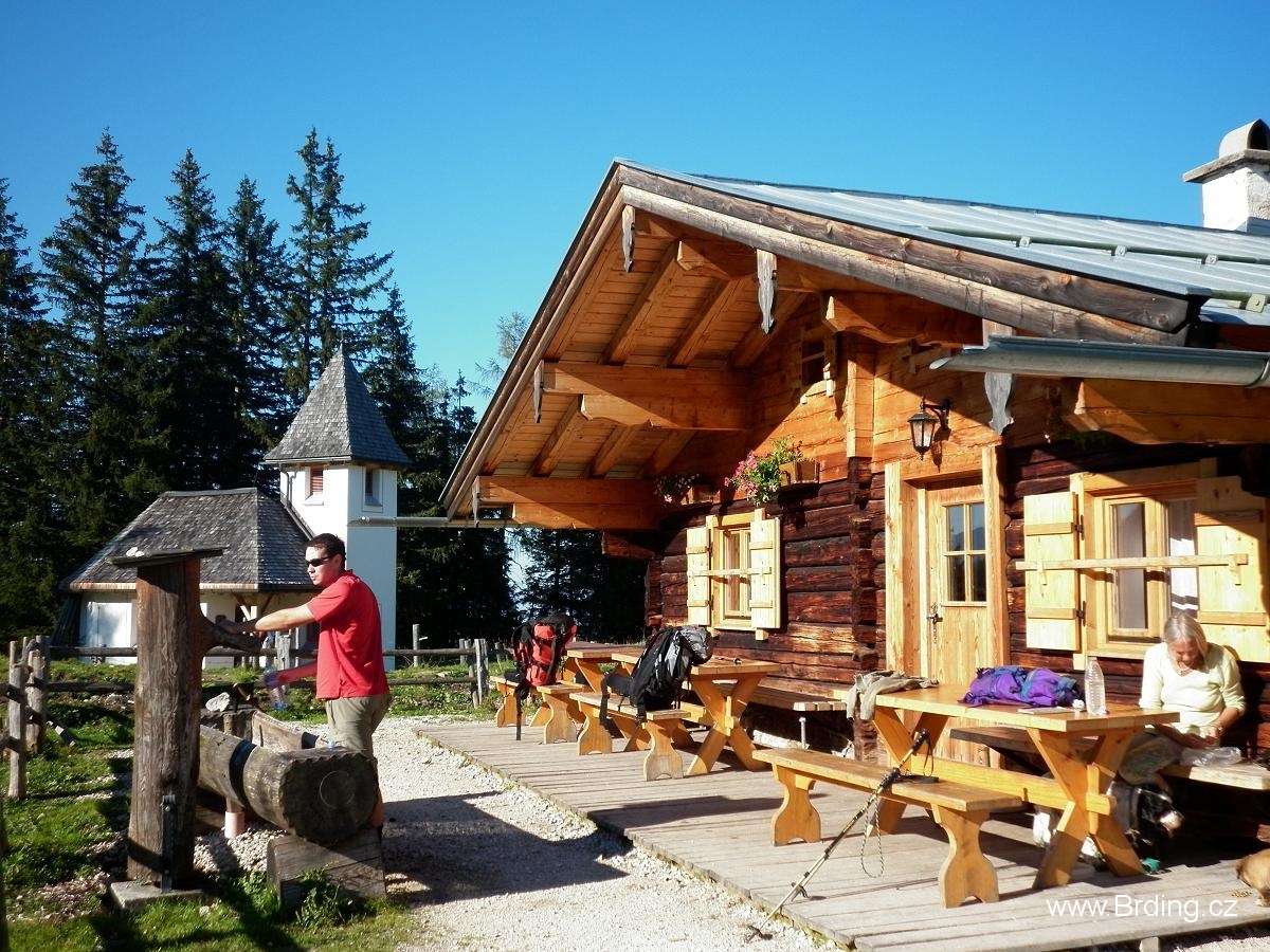 Po chvilce se zvedáme a pokračujem dál. Cesta opět vede lesem a za další hodinu chůze přicházíme na Mitterkaser Alm ve výšce 1400 m.n.m. Tohle je nejkritičtější místo. Už je sice odtud vidět cíl dnešní cesty Watzmannhaus, ale čeká na nás největší převýšení během nejkratší vzdálenosti. Pěšina před náma neuvěřitelně "kličkuje" na pětistech výškových metrech. Chata nás ale přitahuje jako magnet a tak po překonání Luďánovo menší krize, zhruba 100 metrů před cílem, shazujeme na louce před chatou bágly z našich zad. Je 10 minut po 18 hodině a to je o hodinu míň než bylo psáno na tabulce dole.