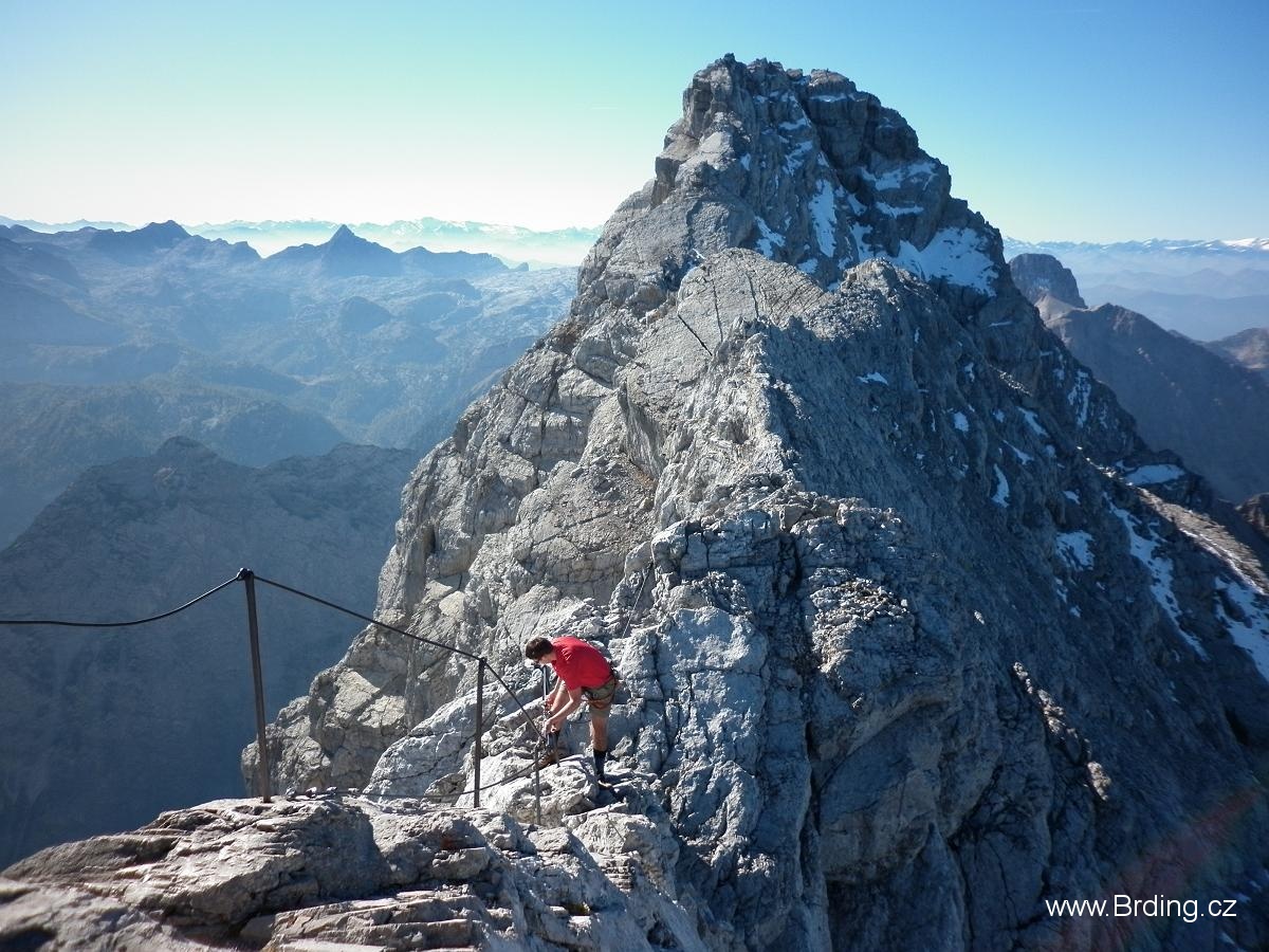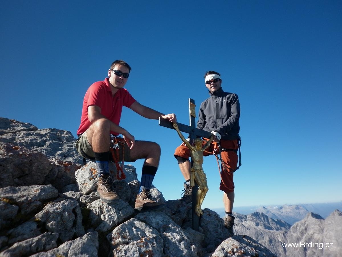 Nabíráme rychle výšku a zhruba za hodinu už nás vítají první paprsky slunce, výška 2300 m.n.m. Dál pokračujem přímo po hraně stěny, pomocí ocelových lan překonáváme malý skalní stupeň a přicházíme na jakýsi předvrchol hory. Odtud se nám otevírá překrásný pohled do karu mezi vrcholy obou Watzmannů. Pamatuju si, že před 4 roky v srpnu, kdy jsem tu byl naposled, zde již leželo dost sněhu. Letos ani vločka. Následující úsek je mírnější, tak máme možnost si trochu vydechnout a připravit se na závěrečnou část výstupu. Přestože vrcholový kříž už máme na dohled, dolézáme k němu asi za 40 minut.