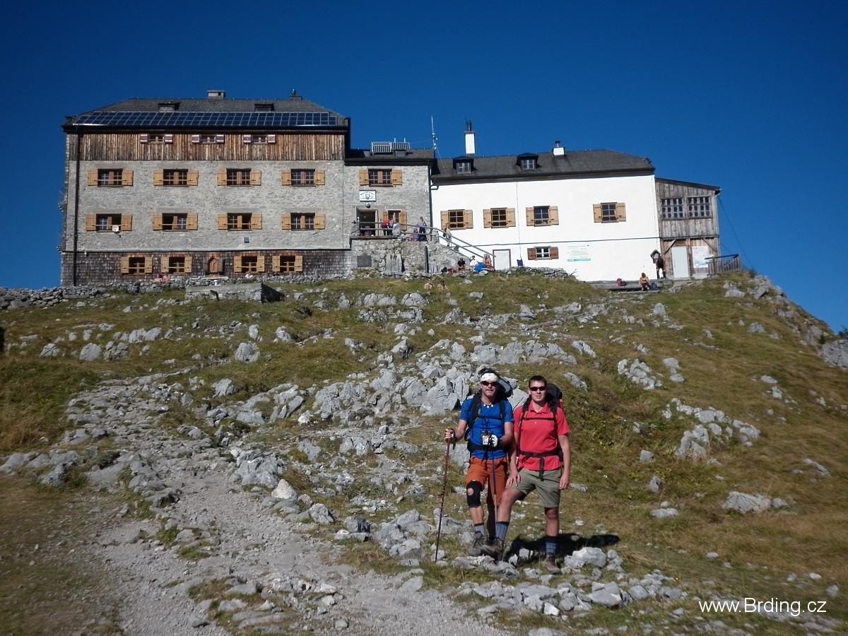 Noční jízda přes Německo a Rakousko proběhla bez problémů a tak chviličku před 9 hodinou vystupujem v Berchtesgadenu na parkovišti. Nacházíme první otevřenou kavárnu a jdeme se trochu vzpružit dávkou kofeinu. Ranní kapučíno, azurové nebe a na říjen nezvyklé teplo nám ihned zlepšily náladu. Jdem si tedy ještě projít střed města, zajdem se podívat i do místního kostela, nesmí chybět samozřejmě nekolik fotografií a poté se pomalu přesouváme ke Königssee. Davy turistů a problémy s hledáním parkování (je neděle a hezké počasí) nám náladu opět trochu pokazily, tak uděláme jen malou procházku podél jezera, nakoupíme několik suvenýrů pro naši Brdingpartu a popojíždíme do Ramsau, odkud budeme začínat náš výstup. Na ten se vydáváme zhruba v 15 hodin. Protože cesta na Watzmannhaus trvá přibližně 4 hodiny, měli by jsme to pohodlně stihnout do tmy. Z předešlých horských akcí mám zkušenost, že časy uváděné na tabulkách jsou docela nadhodnocené. Hned od začátku se lesní pěšina pod našima nohama pěkně zvedá a tak poměrně rychle nabíráme výšku. Za hodinu jsme na Stuben Alm ve výšce necelých 1100 m.n.m. a dáváme si malou pauzu a svačinu. Už se před náma poprvé otvírají nádherné pohledy na okolní kopce, tak se pochopitelně i fotí.