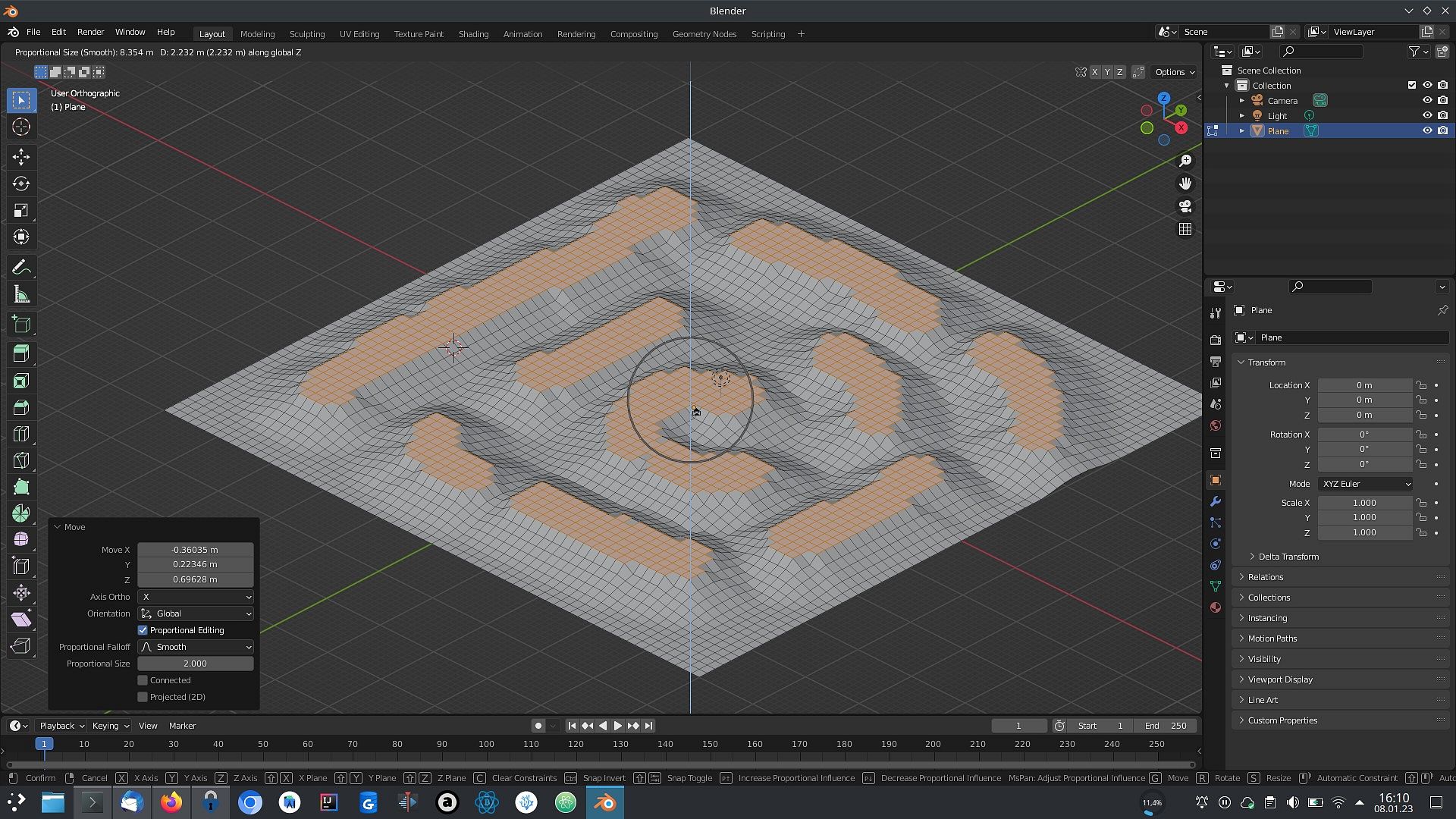 Nahoře zapnout Proportional editing, následně G po ose Z a zvedáme (kolečkem lze navíc měnit proporce)