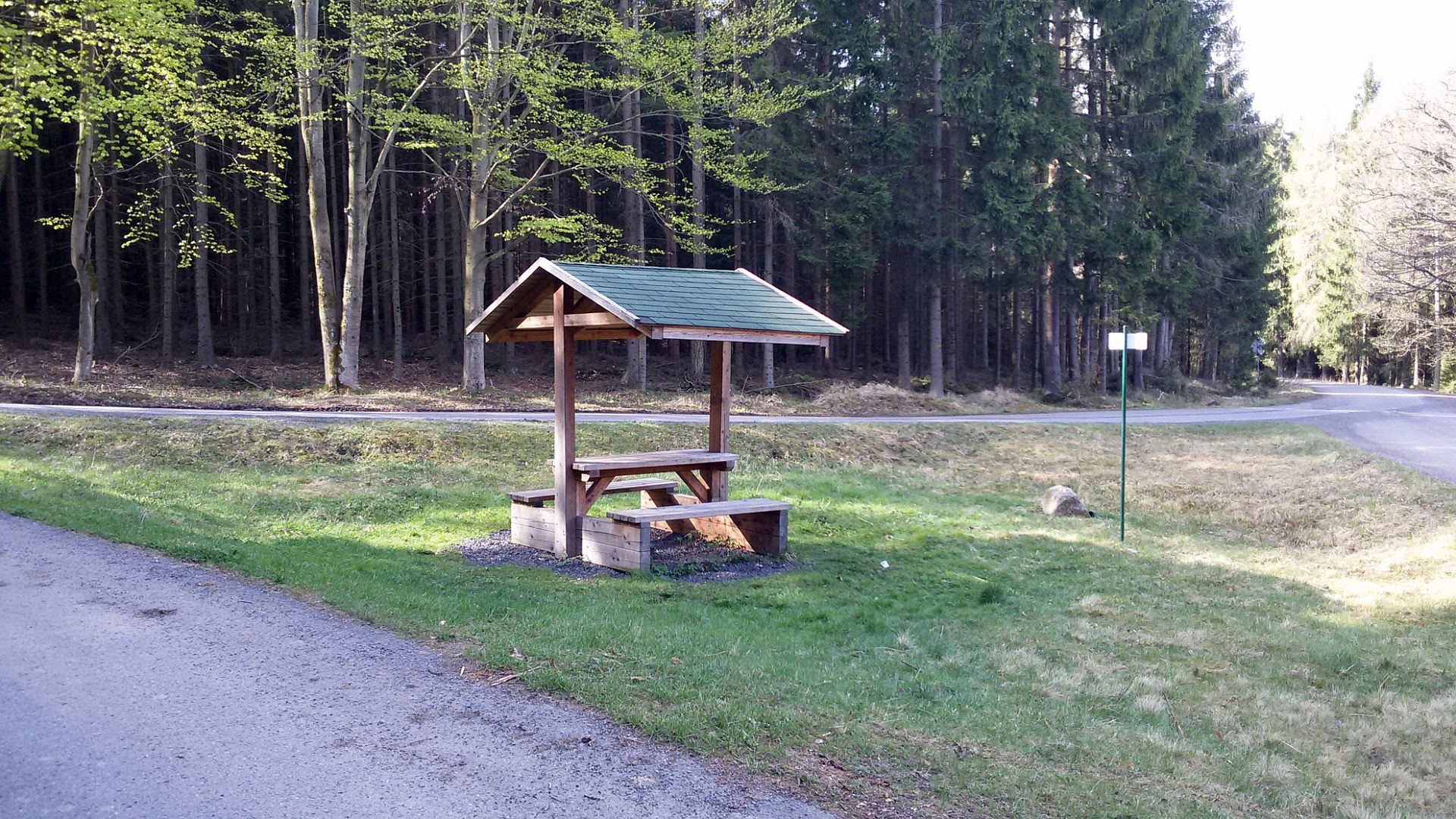 Kryté posezení pro turisty u lesní cesty Dobrotivské ve Středních Brdech.
