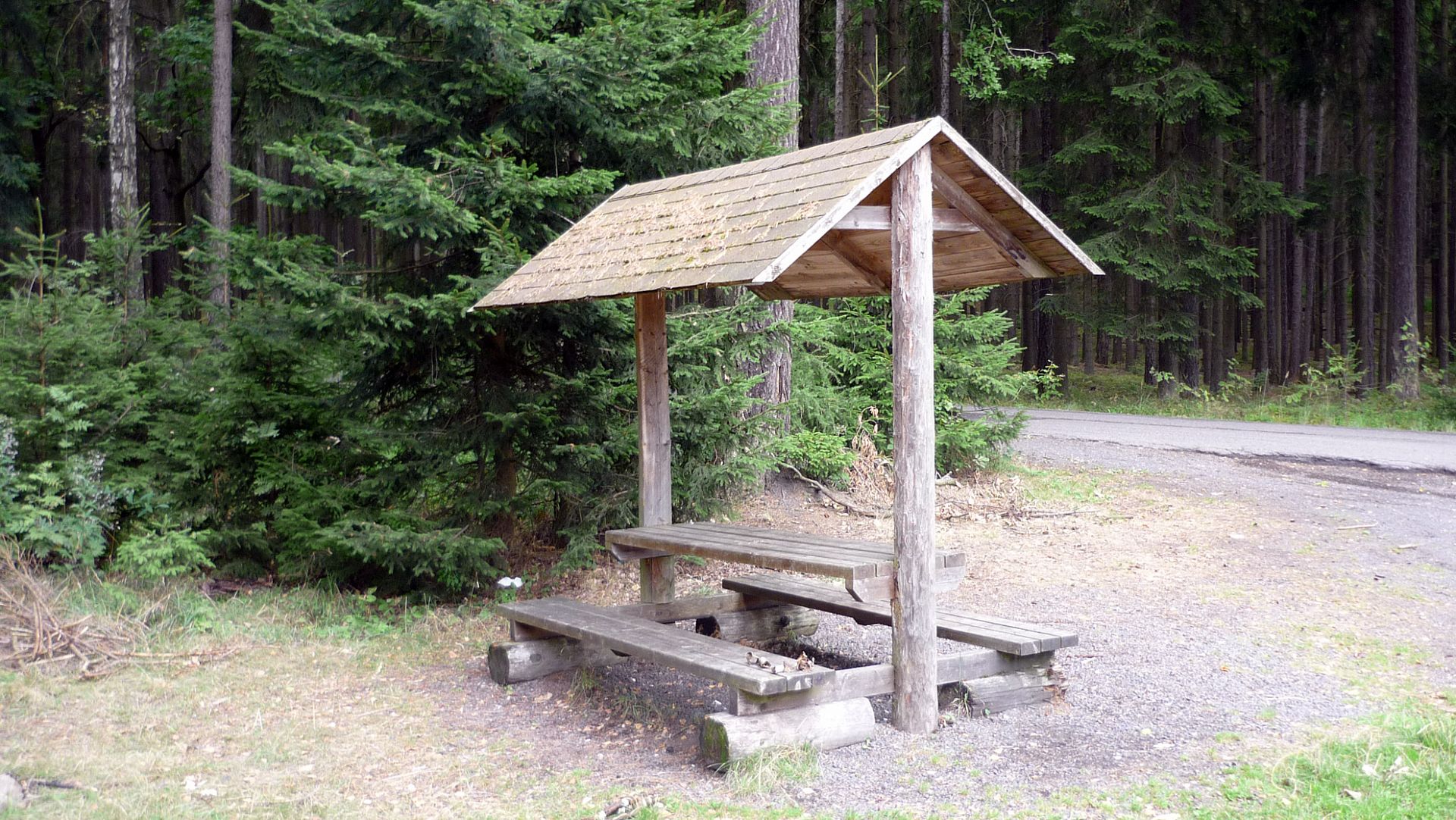 Kryté posezení pro turisty u hájovny Krejčovky ve Středních Brdech.