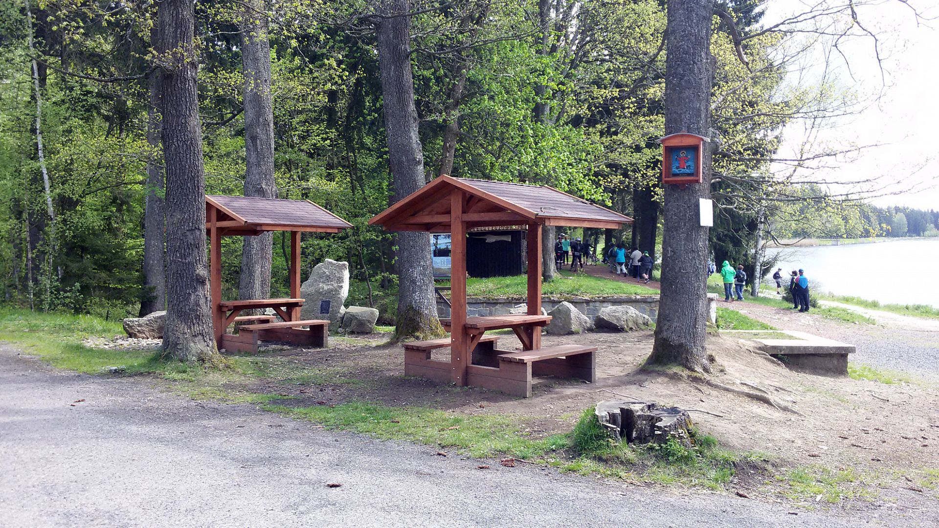 Kryté posezení pro turisty u Hořejšího Padrťského rybníka.