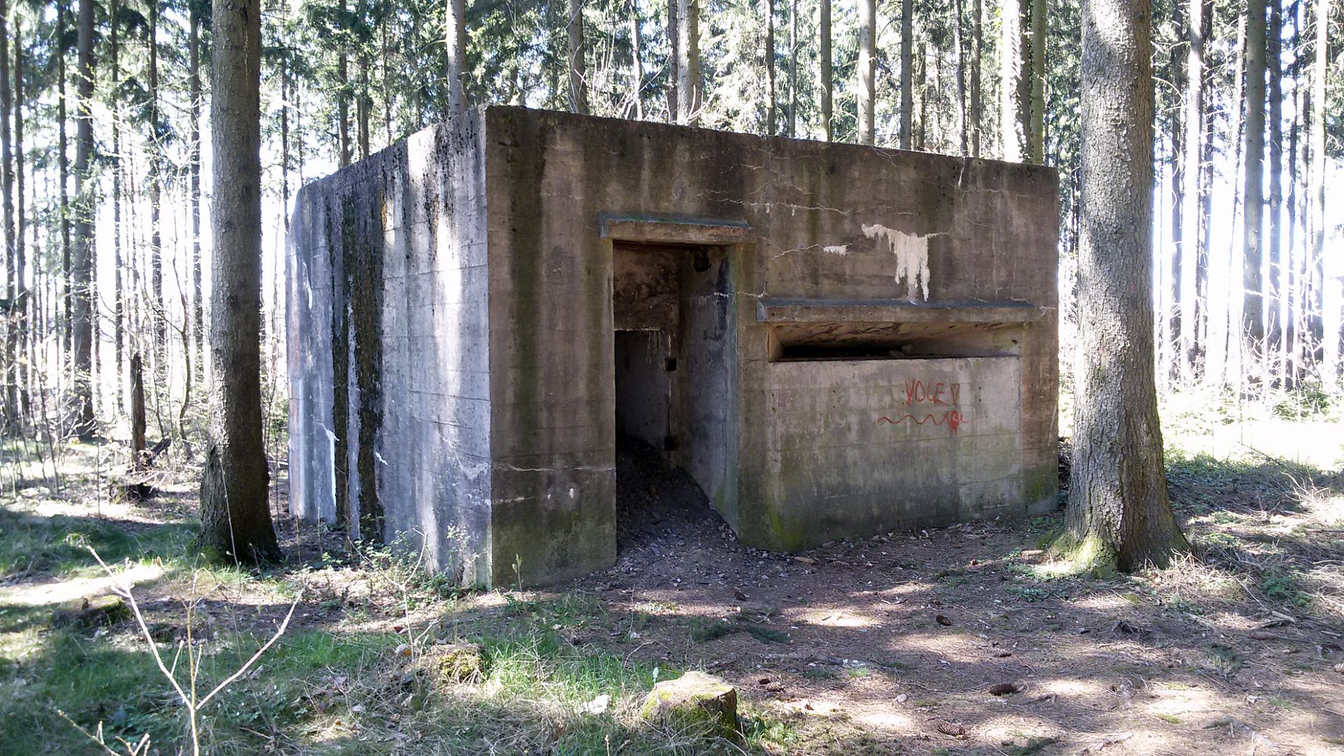 Německá pozorovatelna (pixle) stojí pár desítek metrů v lese severně od cesty v Myti.