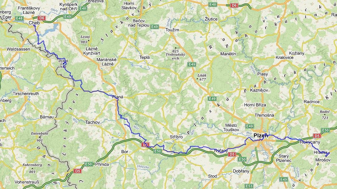 Hledání nové varianty trasy Cheb - Plzeň - Rokycany, kdy jsme chtěli vynechat Mariánské Lázně (jeli jsme je již x krát) jsme zvolili následovně - chceme jet přes vrchol Dyleň (primární cíl), Český les opustíme v Broumově a pak už jen klasická Planá, Kralupy, Nýřany, Plzeň a Rokycany.