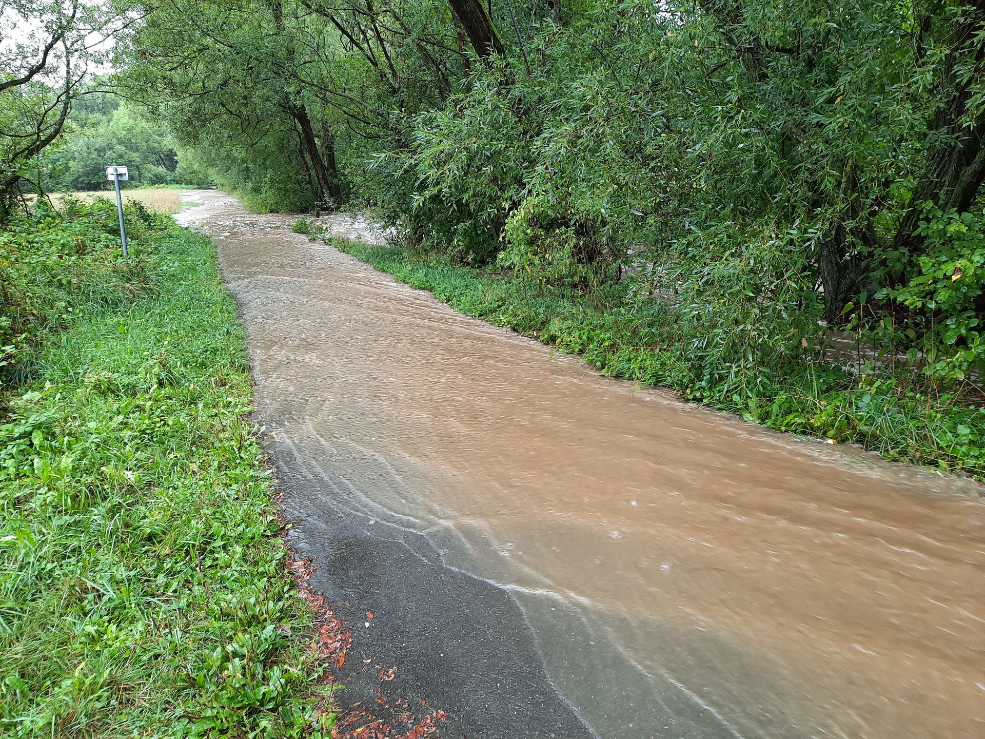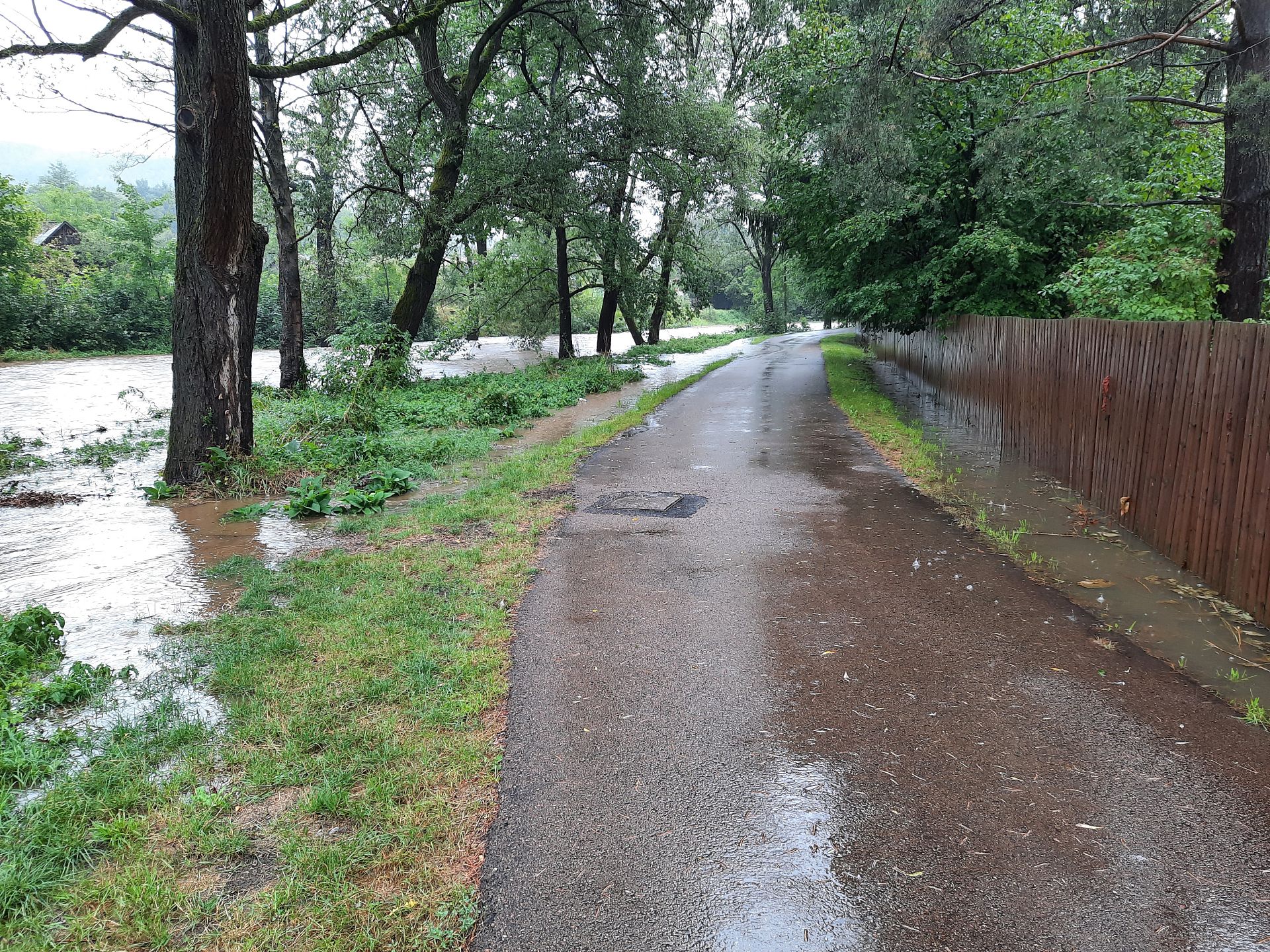 Na přiložených fotografiích je vidět, že pod vodou se ocitla i část cyklostezky mezi Hrádkem a Dobřívem.